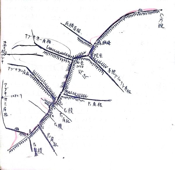 | P5からP6にかけて、よく偵察しなかったため、P6よりルートを間違えて、西側の稜へ降りてしまった。 |