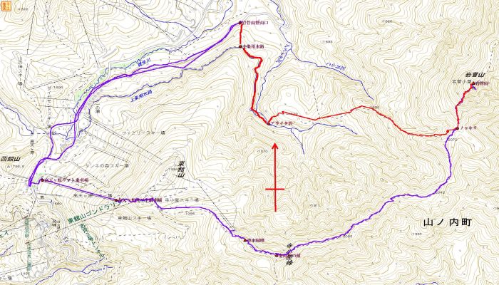 当初の予定は、発哺温泉の東館山ゴンドラリフトで上がって稜線を縦走して岩菅山へ登る計画でした。ゴンドラ乗り場に着いてみると、戸が閉まっていて、8時40分が始発とあります。1時間半も待つのはもったいないので、逆コースで一の瀬から上がって、ノッキリから岩菅山を往復し、金山沢の頭から寺子屋峰を回ることにしました。