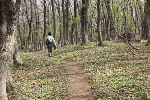 お目当ては、カタクリです。通常はピンクか淡い紫ですが、ここには片栗粉のように白いカタクリがあります。 |
