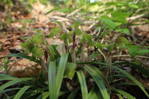 | そのまた下に、シュンランが花を咲かせていました。地味な花なので、見落としそうです。 |