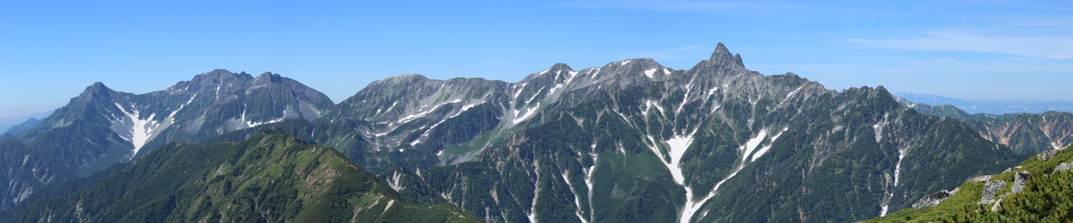 前穂から槍ヶ岳までの稜線。涸沢カールの雪渓が白く映える。