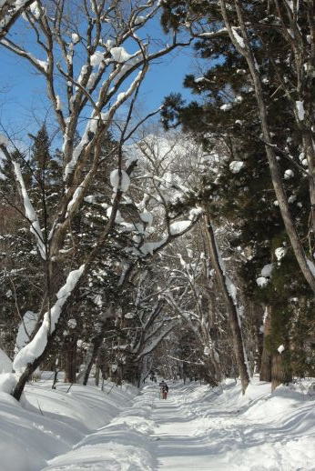 参道を歩くと、凛としたものを感じます。昨夜あたり降ったのでしょうか、参道脇の木々が雪で被われていて、雪が、キラキラ輝きながら風に舞っていました。 |